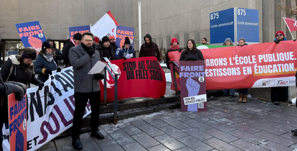 Québec 18 novembre 2025 – À l’approche de la mise à jour économique du gouvernement Legault et à l’invitation de la Coalition Main rouge, des groupes syndicaux et communautaires se sont rassemblés devant le Conseil du trésor pour dénoncer les conséquences des compressions budgétaires et des politiques d’austérité menées par la CAQ. Plusieurs bannières ont été déployées pour visibiliser les enjeux d’éducation, de santé, de transport, de logement, en plus de tout ce qui touche à l’insuffisance de revenus. Les groupes sont donc passés à l’action pour rappeler l’urgence de réinvestir massivement dans les services publics et les programmes sociaux.