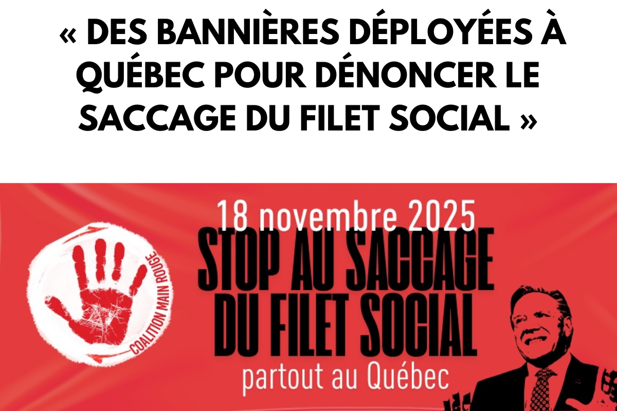 Québec 18 novembre 2025 – À l’approche de la mise à jour économique du gouvernement Legault et à l’invitation de la Coalition Main rouge, des groupes syndicaux et communautaires se sont rassemblés devant le Conseil du trésor pour dénoncer les conséquences des compressions budgétaires et des politiques d’austérité menées par la CAQ. Plusieurs bannières ont été déployées pour visibiliser les enjeux d’éducation, de santé, de transport, de logement, en plus de tout ce qui touche à l’insuffisance de revenus. Les groupes sont donc passés à l’action pour rappeler l’urgence de réinvestir massivement dans les services publics et les programmes sociaux.